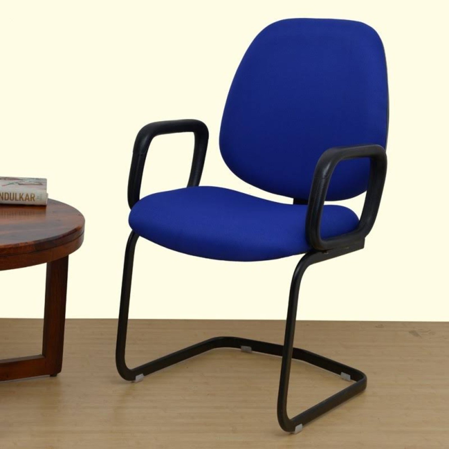 ply wood frame cushion blue color fabric seat fixed black round shape handle S type metal powder coated black color base fix office visitor staff chair