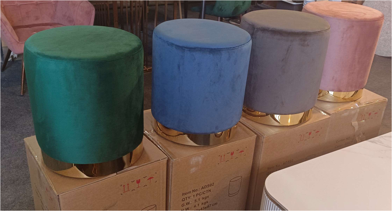 wooden frame golden color lining on base cushion velvet round shape cushion seat home and hotel living area round shape puffy manufacturer and designer