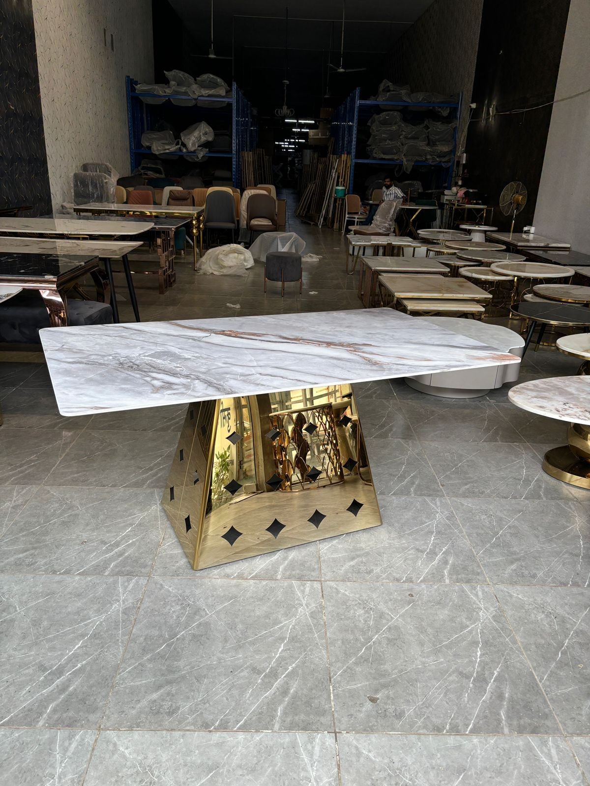 SS Base rose gold finish designer pyramid design base with onxy marble on top designer 6 seater marble top dining table for home, hotel and restaurant manufacturer and designer